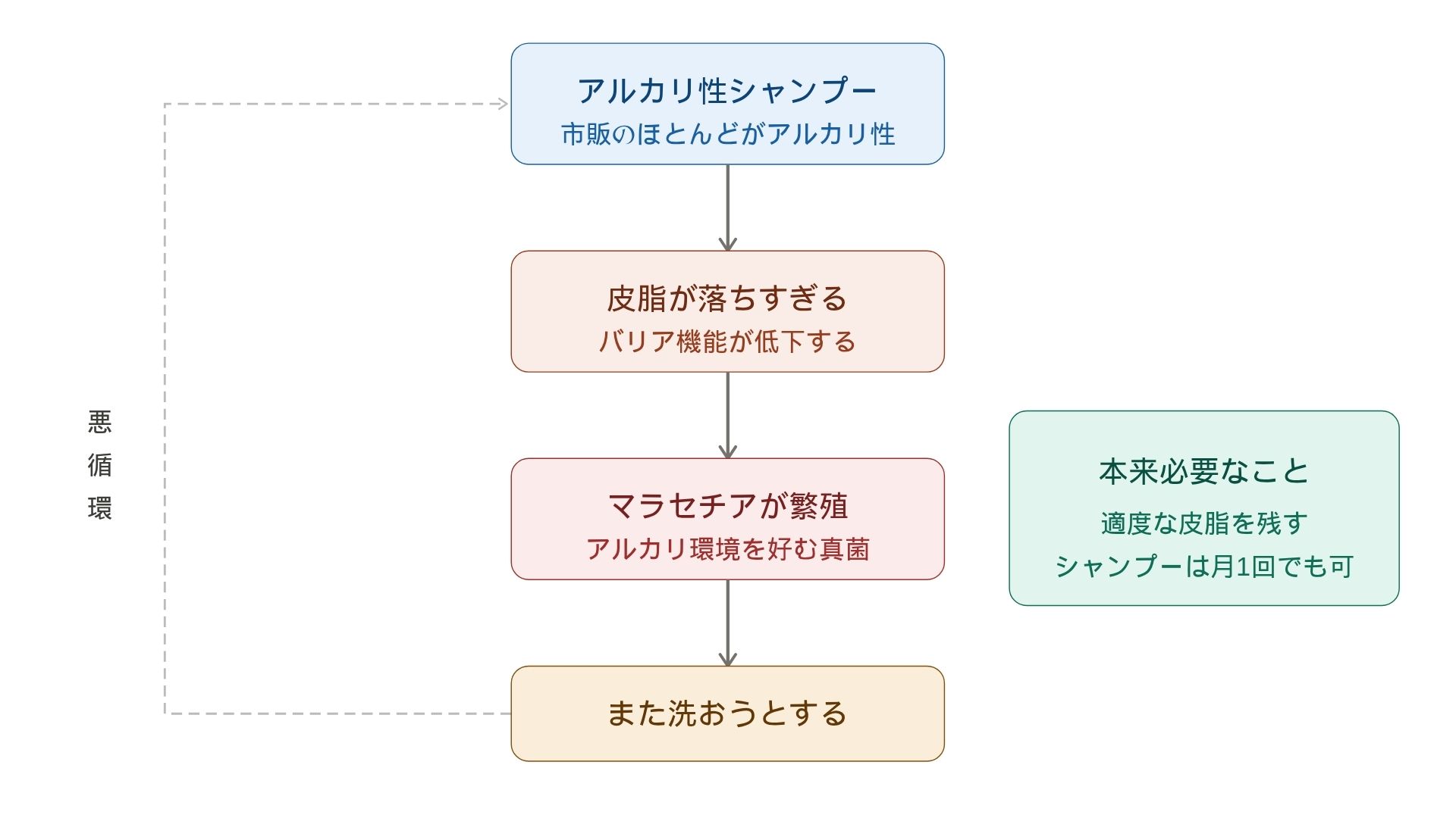 洗いすぎると皮脂が落ちすぎる。皮脂はバリアの一部です。バリアが壊れた皮膚は外敵に対して無防備になる。また常在菌が侵入する。また薬を使う——このループが続きます。