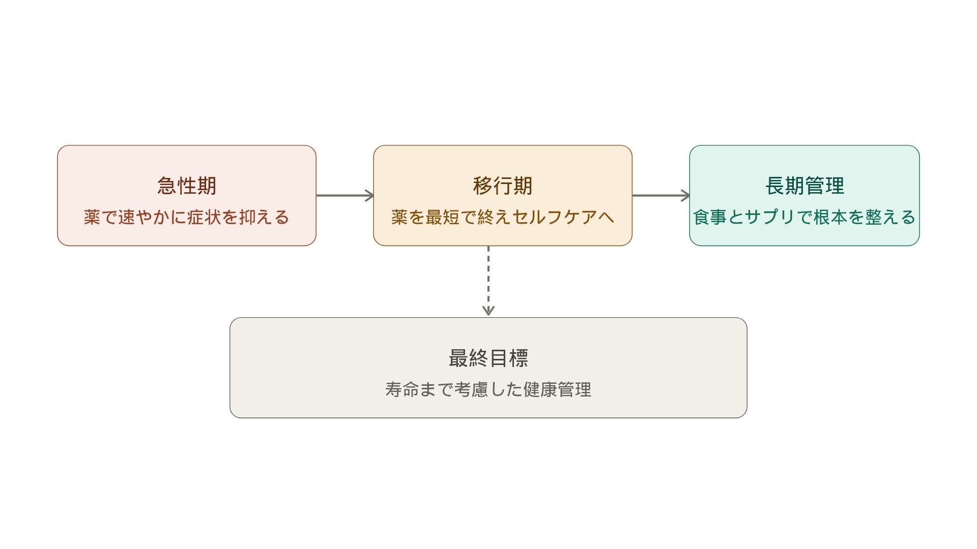 急性期・症状が強い時期は、薬で速やかに症状を抑える。落ち着いてきたら、薬を最短で終えてセルフケアへ移行する。もちろん同時でも良い。いずれにしても長期管理は食事とサプリで根本を整える。