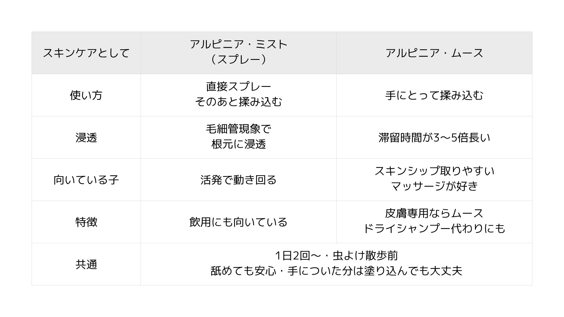 どちらも共通のコツ: 舐めても安全ですが、皮膚に届けることが目的なので舐める前に浸透させたい。散歩前に使うか、食事前に使うと舐める前に他のことに集中してくれます。なお量は被毛の量によりますが、しっとりする程度です。基本は湿った毛は、拭かずに自然乾燥させてください。